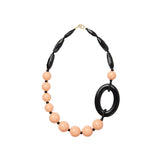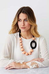 A black and pink beaded necklace with an 'opera' neckline - a classic necklace that works well with your go-to turtleneck