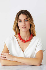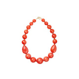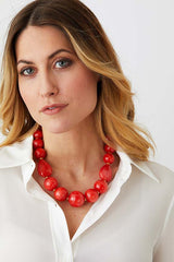 A fiery orange-coral statement piece - a shorter beaded necklace well suited for a collared shirt!